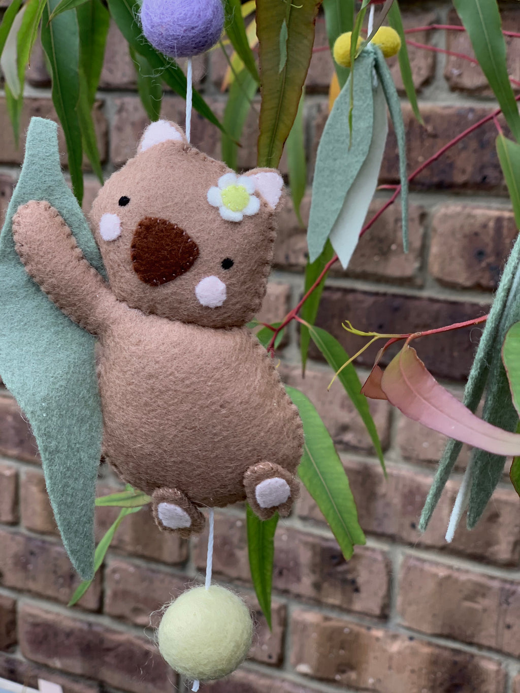 100% wool felt baby mobile. Designed and handmade in Tasmania. Mobiles are made to order, so can be customised to your needs. 20 cm bamboo hanger. This is not a toy and needs to be hung out of babies reach.