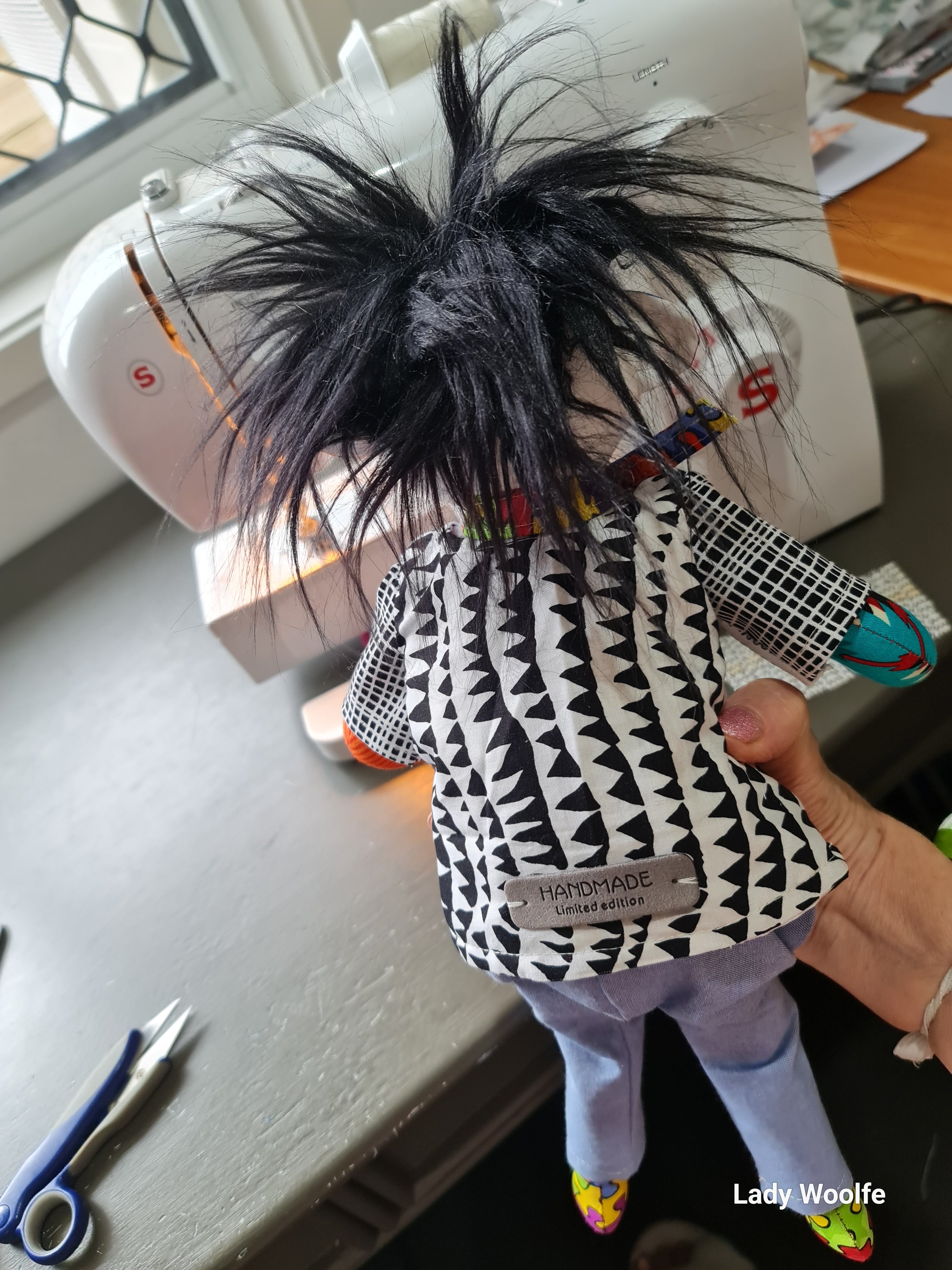 I have handmade this art doll, using mostly new fabrics, but have also incorporated a few bits and pieces of recycled fabric/buttons.