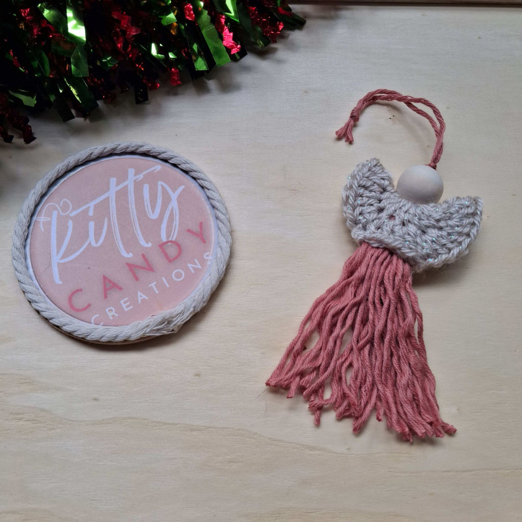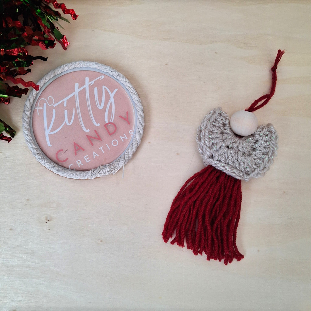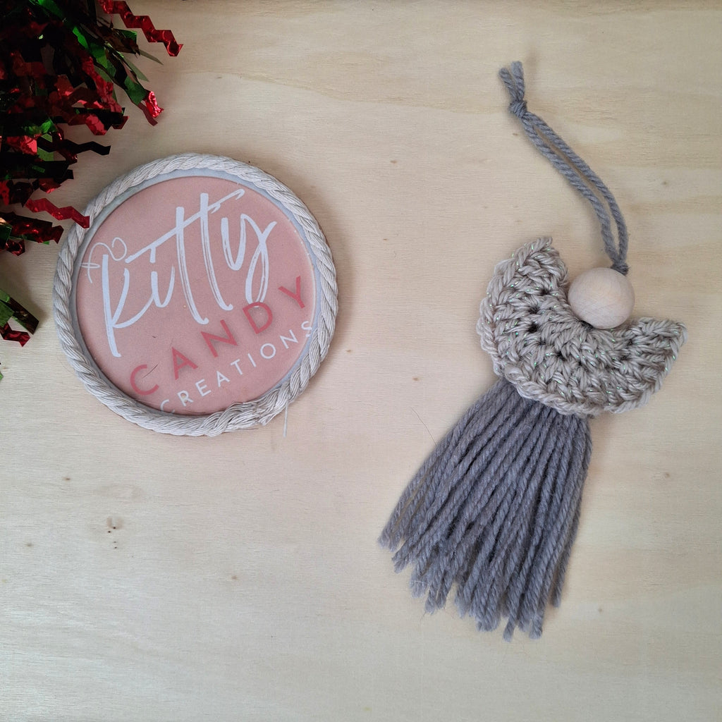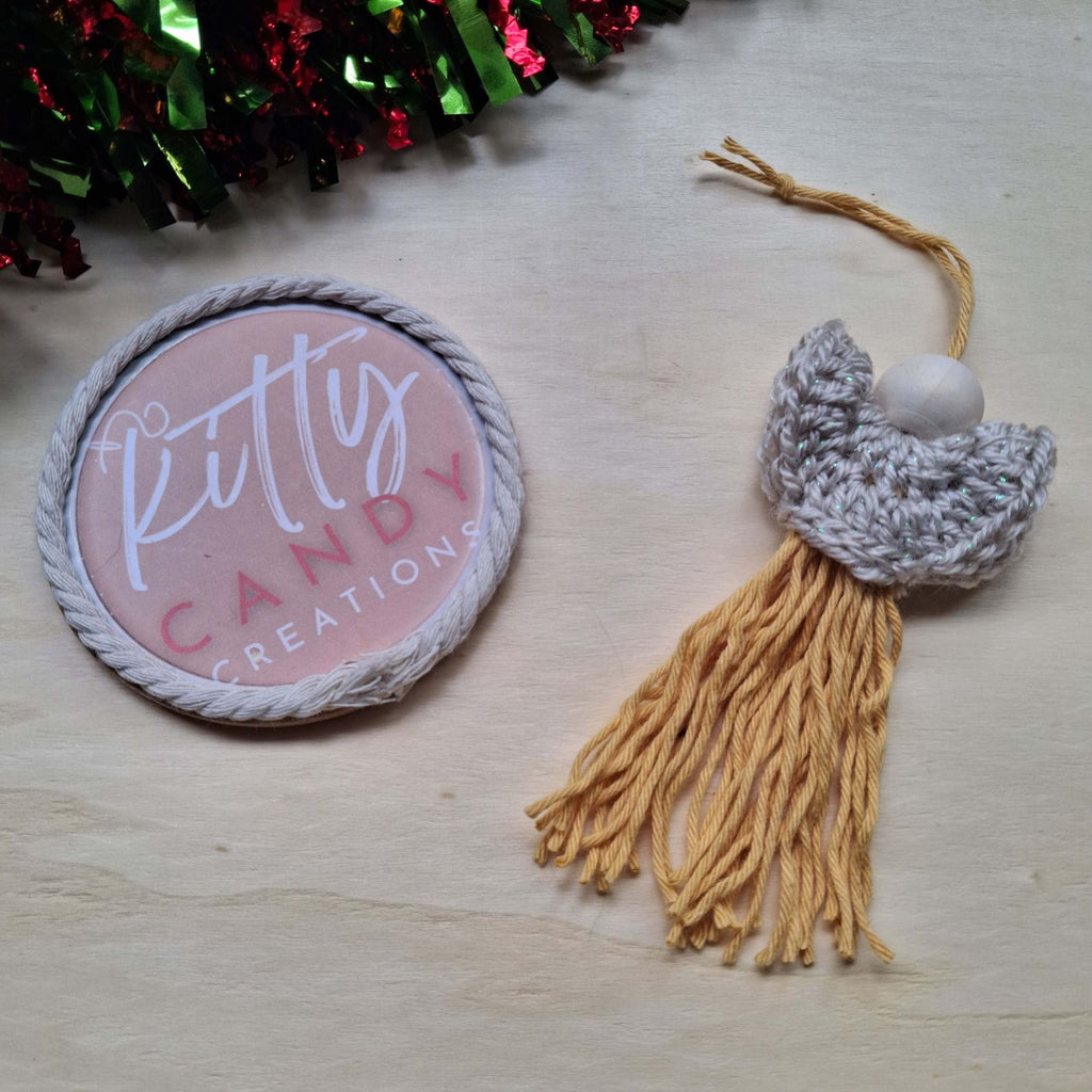 A simple yet stunning angel to adorn your Christmas tree! Handcrafted from a variety of yarns including cotton, wool and acrylic. The angel's dress has a subtle Christmas sparkle.