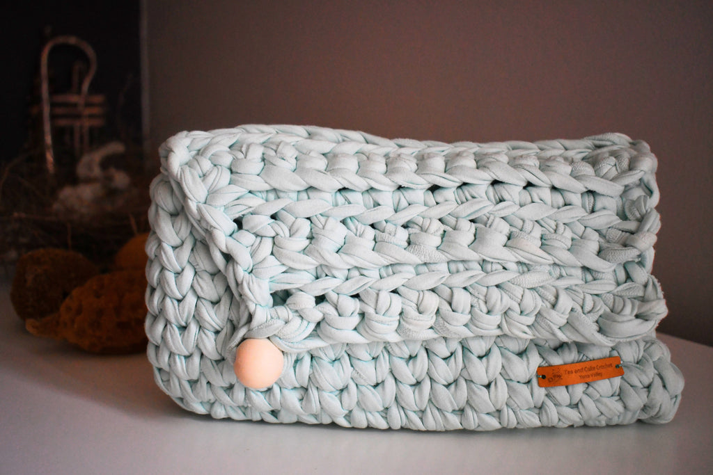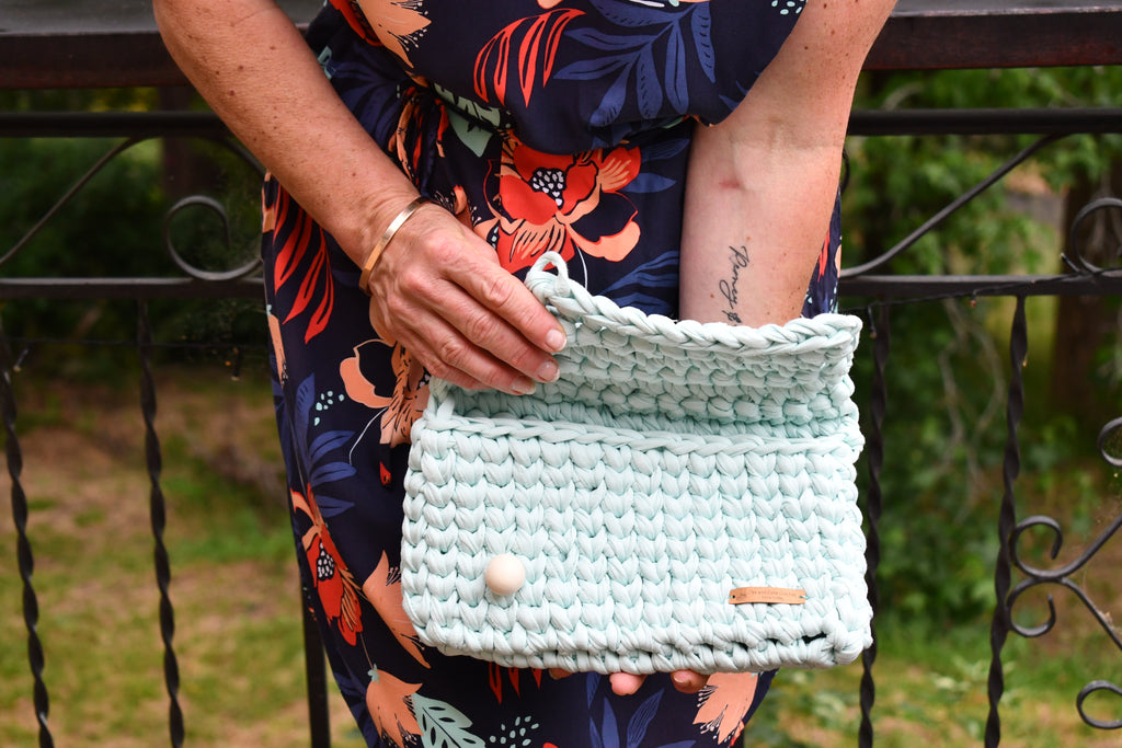 This fresh mint green crocheted clutch is a 'One of a Kind' individual design with its unique clasp structure and asymmetrical design and is perfect for a Summer outing