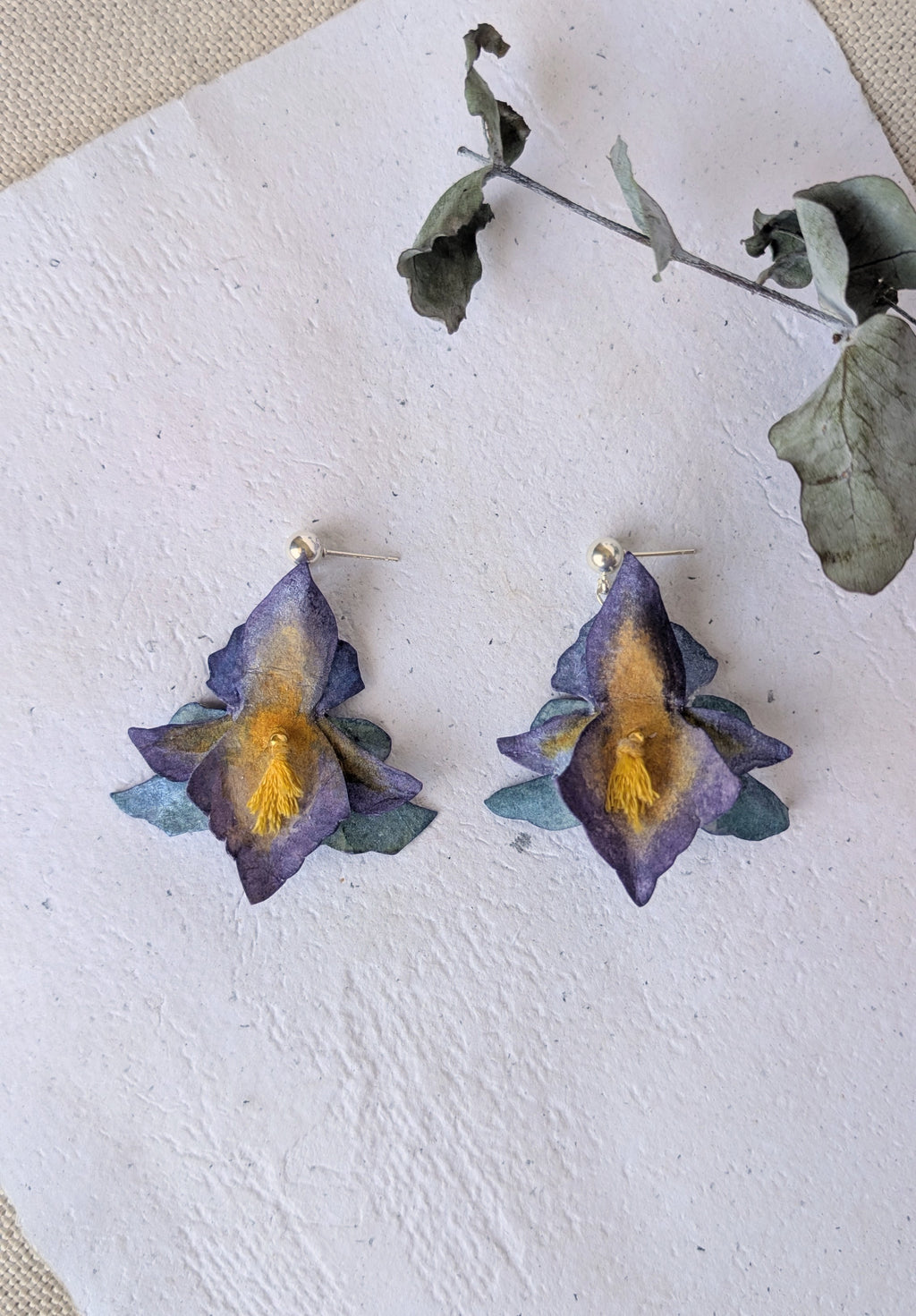 Each pair is made slowly by hand using layered, watercolour-painted paper, shaped petal by petal to capture the softness and structure of the flower. The tiny fibre beard at the centre echoes the natural texture of an iris and adds gentle movement.
