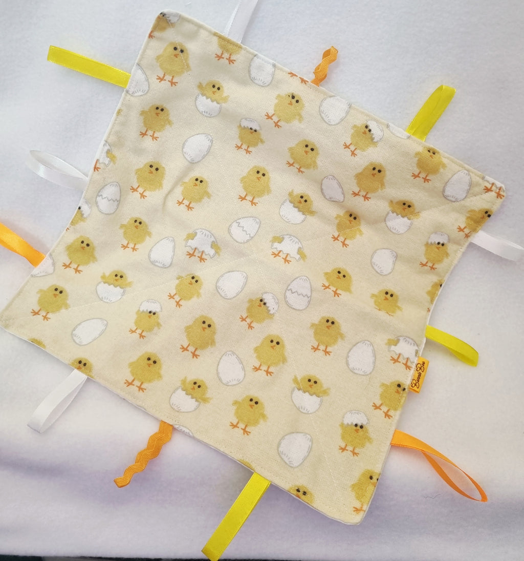The Taggy has flannelette on the front and cotton of the back. There is a inner lining of food grade crinkle paper for a sensory experience.