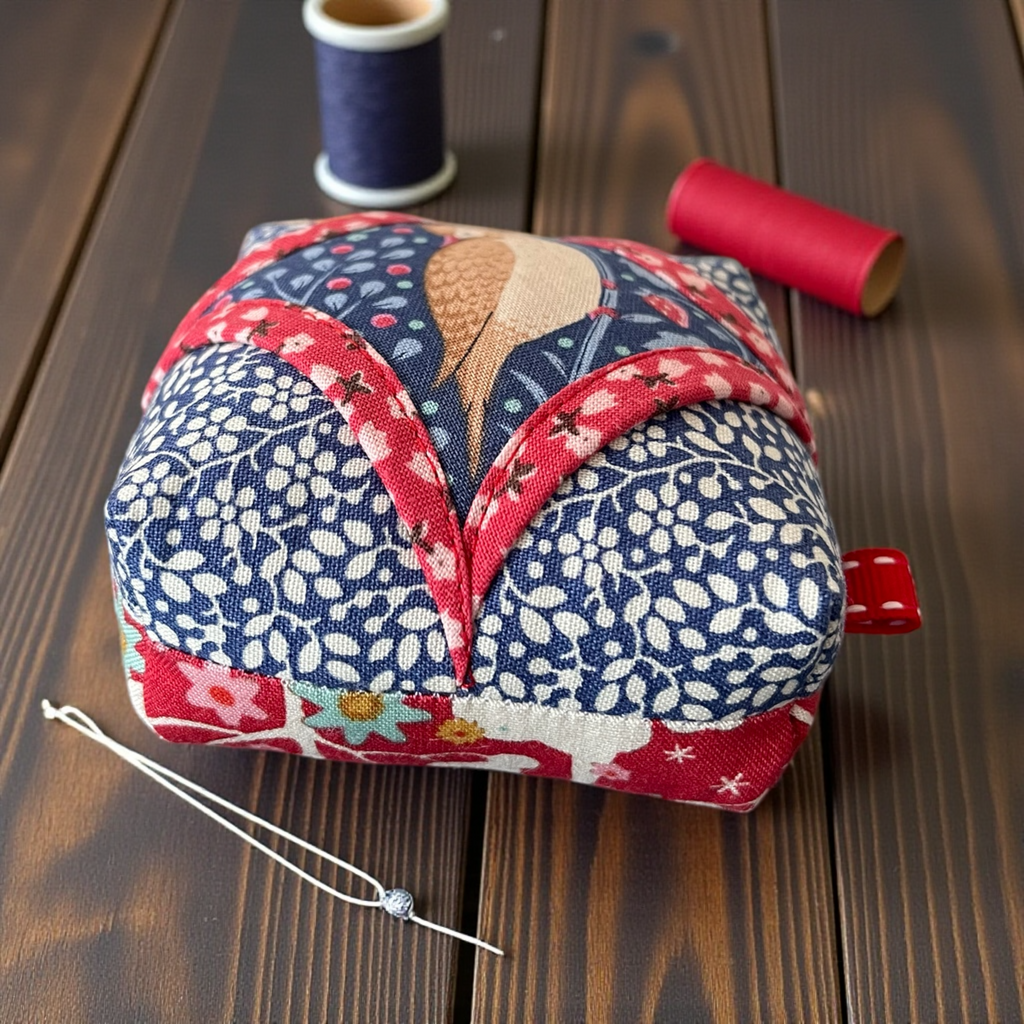 This plump, patchwork pincushion features a sweet bird motif framed by coordinating floral and patterned prints in classic blues and reds. Thoughtfully pieced and securely stitched, it is generously filled to keep your pins and needles safe, organised, and always within easy reach. A small fabric loop adds a delightful finishing touch and makes it easy to move around your sewing table.