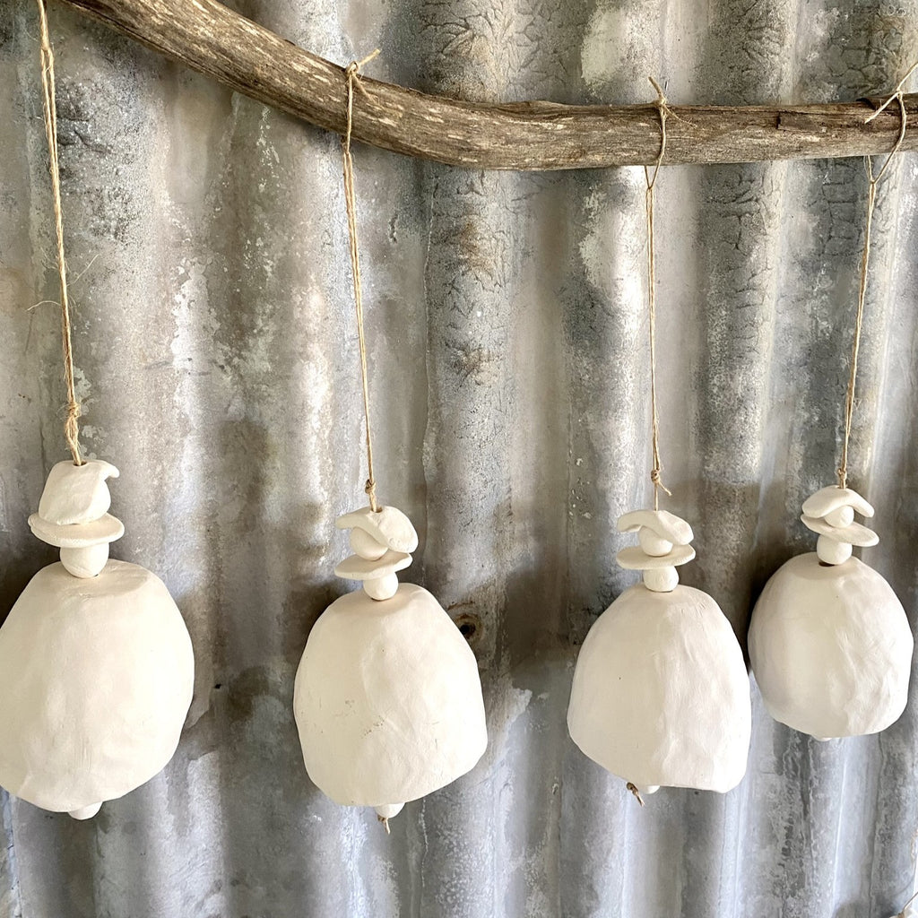 These handmade bells are unglazed with a matte and soft feel hanging on a natural jute string. Made by one pair of hands from start to finish using white earthenware clay.