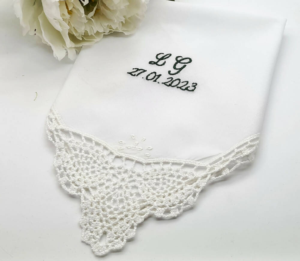 This beautiful ladies cotton handkerchief with a pretty lace edge, will make a perfect gift for a wedding, birthday, anniversary gift, or could just be a gift for someone you love. It has been embroidered with initials, and a date.