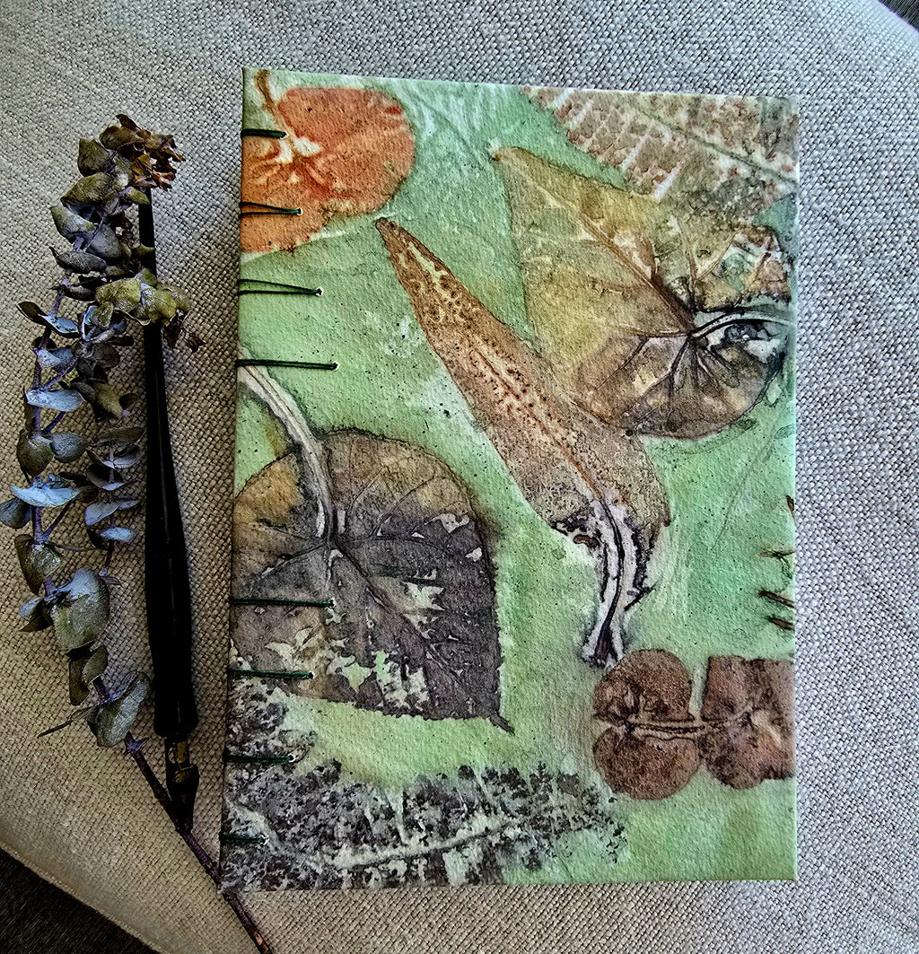Lovingly handmade on the Sunshine Coast, QLD, this one-of-a-kind hand stitched journal is a true piece of functional art. The front and back cover features original artwork, created using natural dyes and eco printing techniques. No two are ever exactly the same.