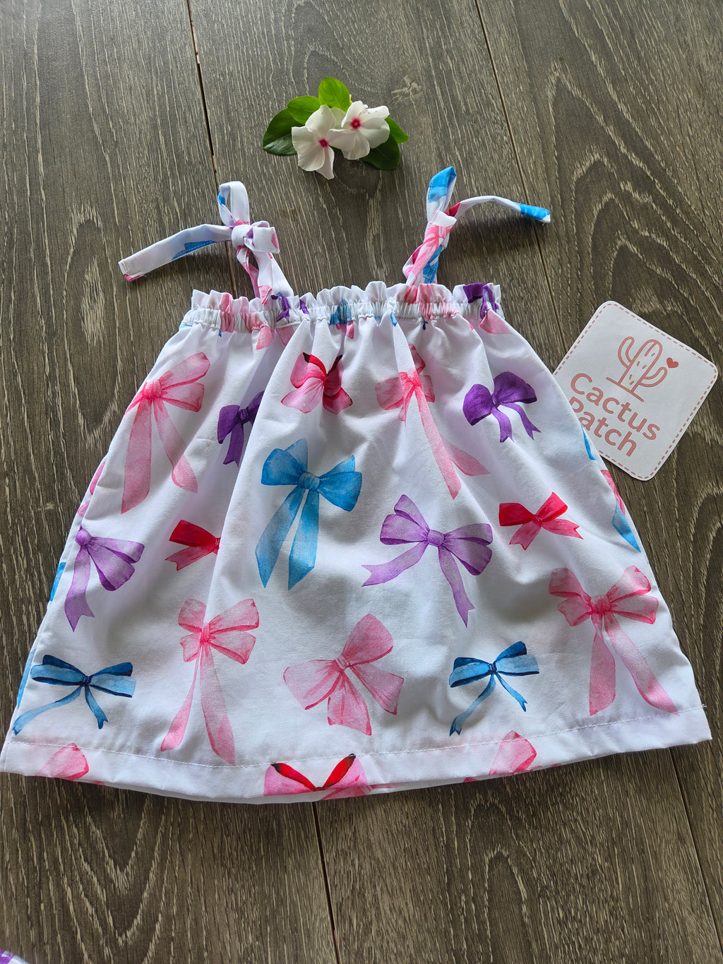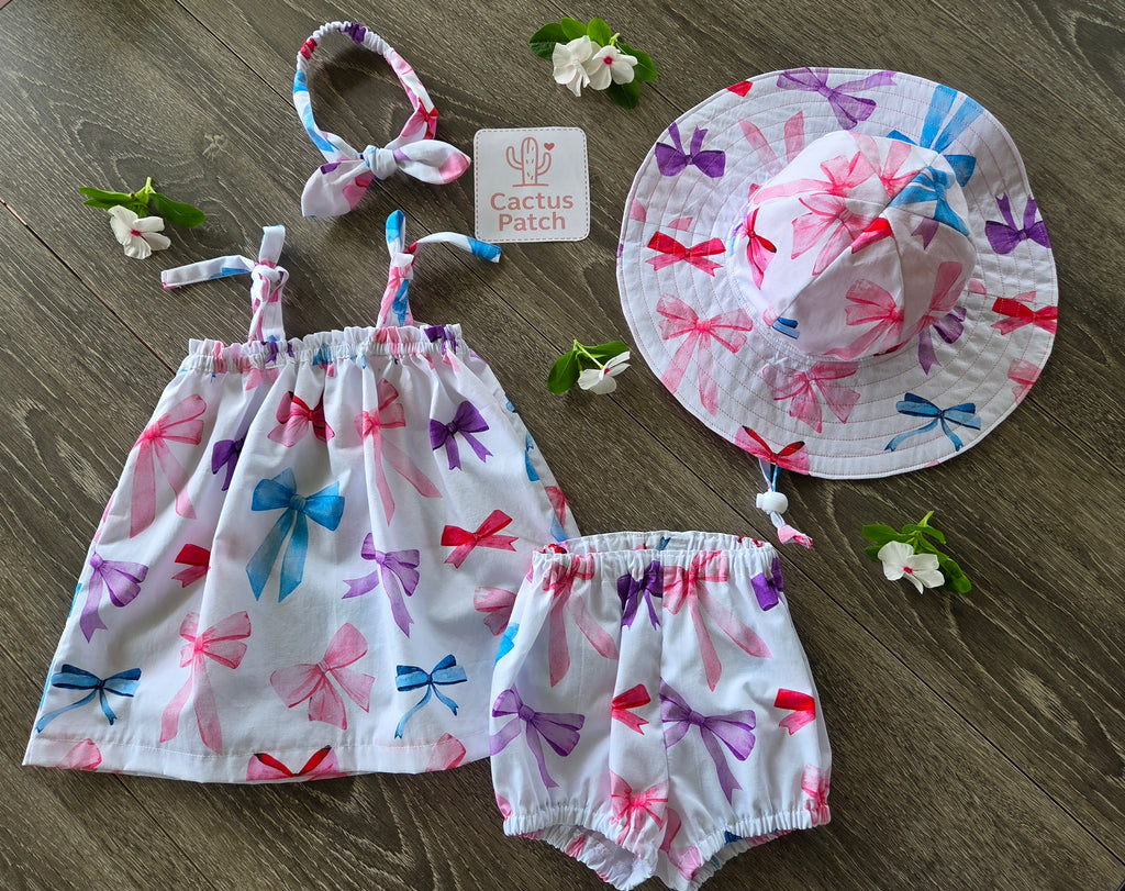 "Beautiful Bows" Dress, Bloomers, Bow & Sunhat - 3-6 Months