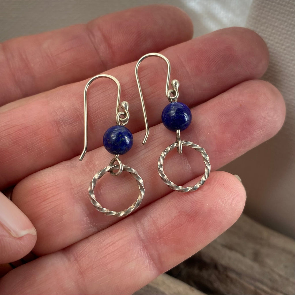 Cute and casual, these handmade lapis lazuli dangle sterling silver earrings are perfect for everyday wear. The little hoops are made of twisted square wire for a bit of sparkle when they catch the light. Silver and Lapis Lazuli are a match made in heaven! They are approximately 3cm from the top of the handmade ear wire to the base of the hoop.