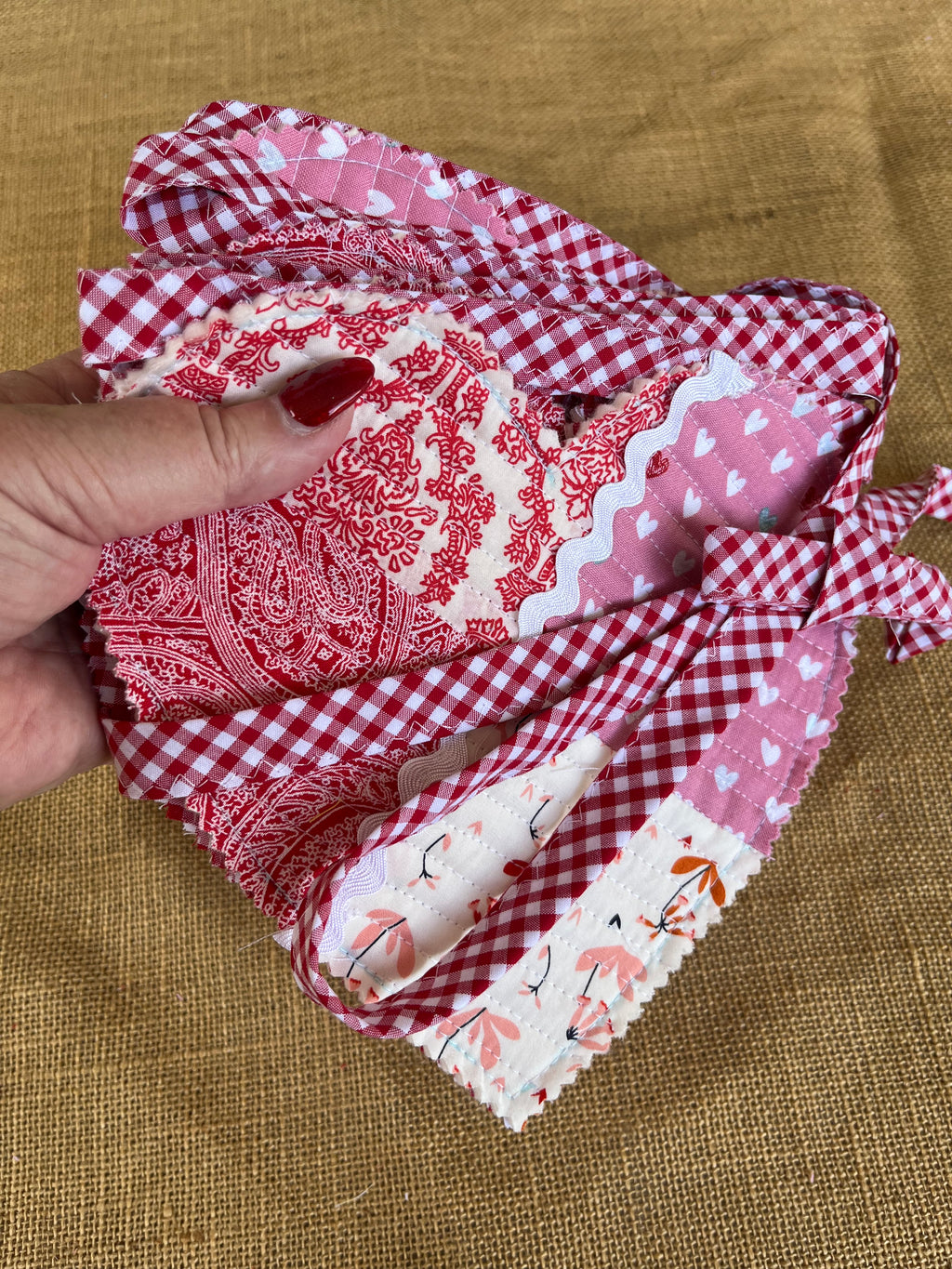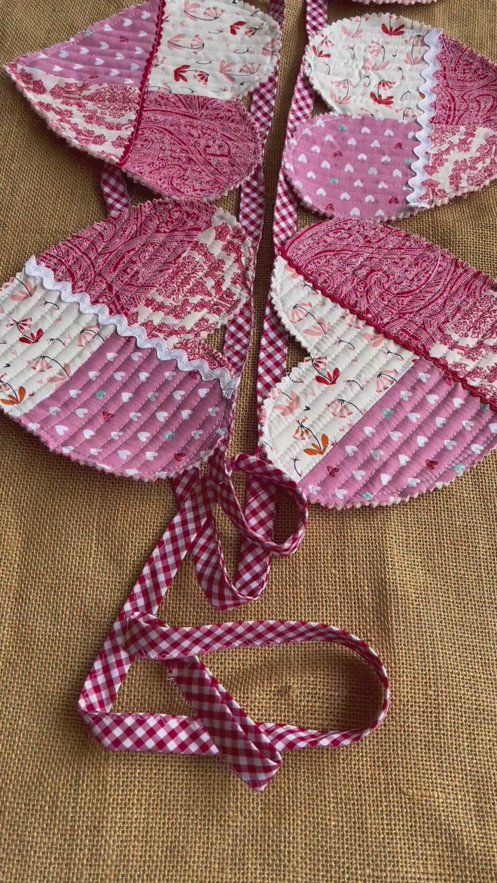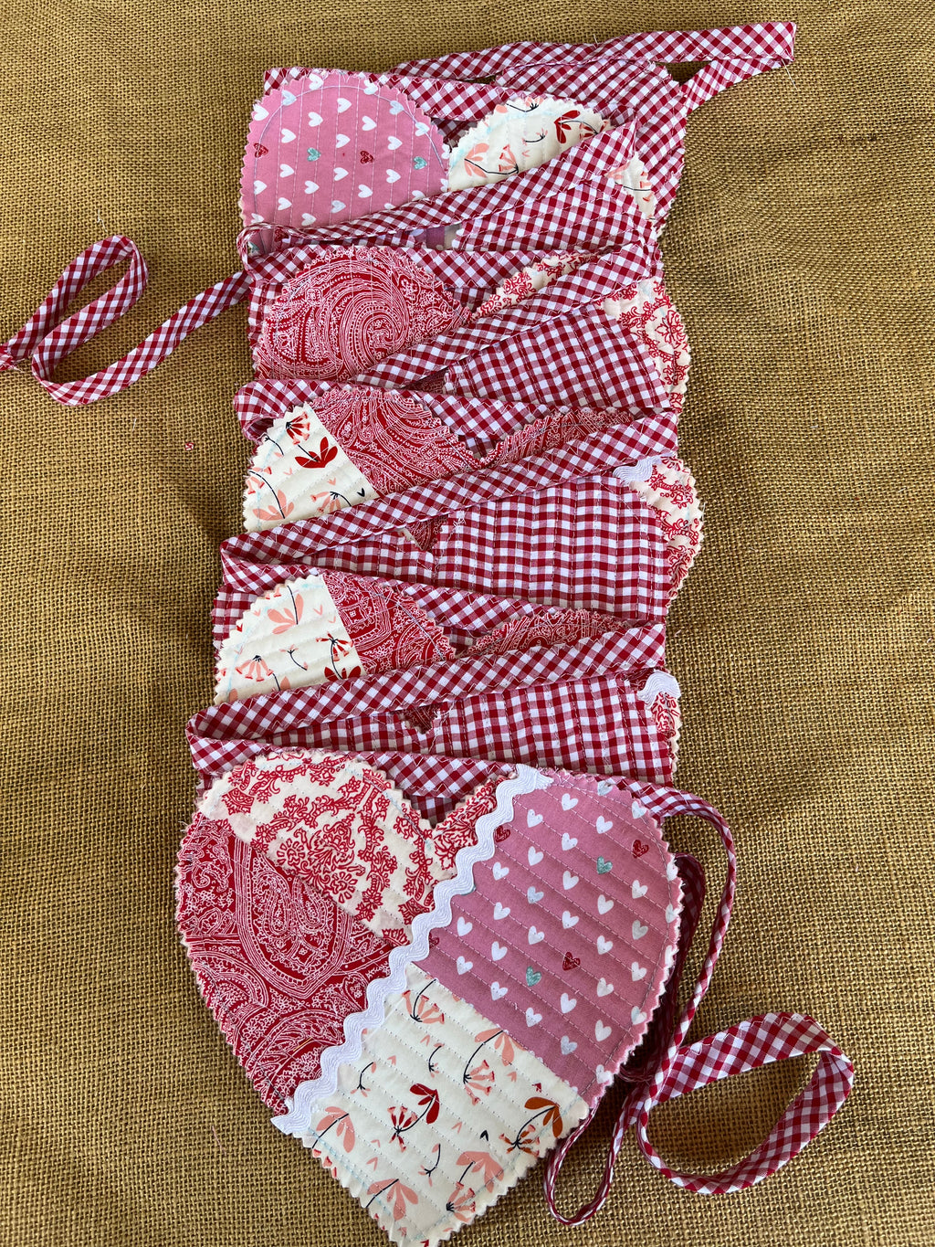 Add a touch of charm and color to any space with this beautiful handmade heart bunting. Each heart is carefully crafted from high-quality fabric in a variety of colours, creating a cheerful and eye-catching display. Perfect for valentines day, nurseries, parties, weddings, or as a lovely home décor accent. The hearts are securely stitched and strung on a durable handmade bias-binding, ready to hang and brighten your room.