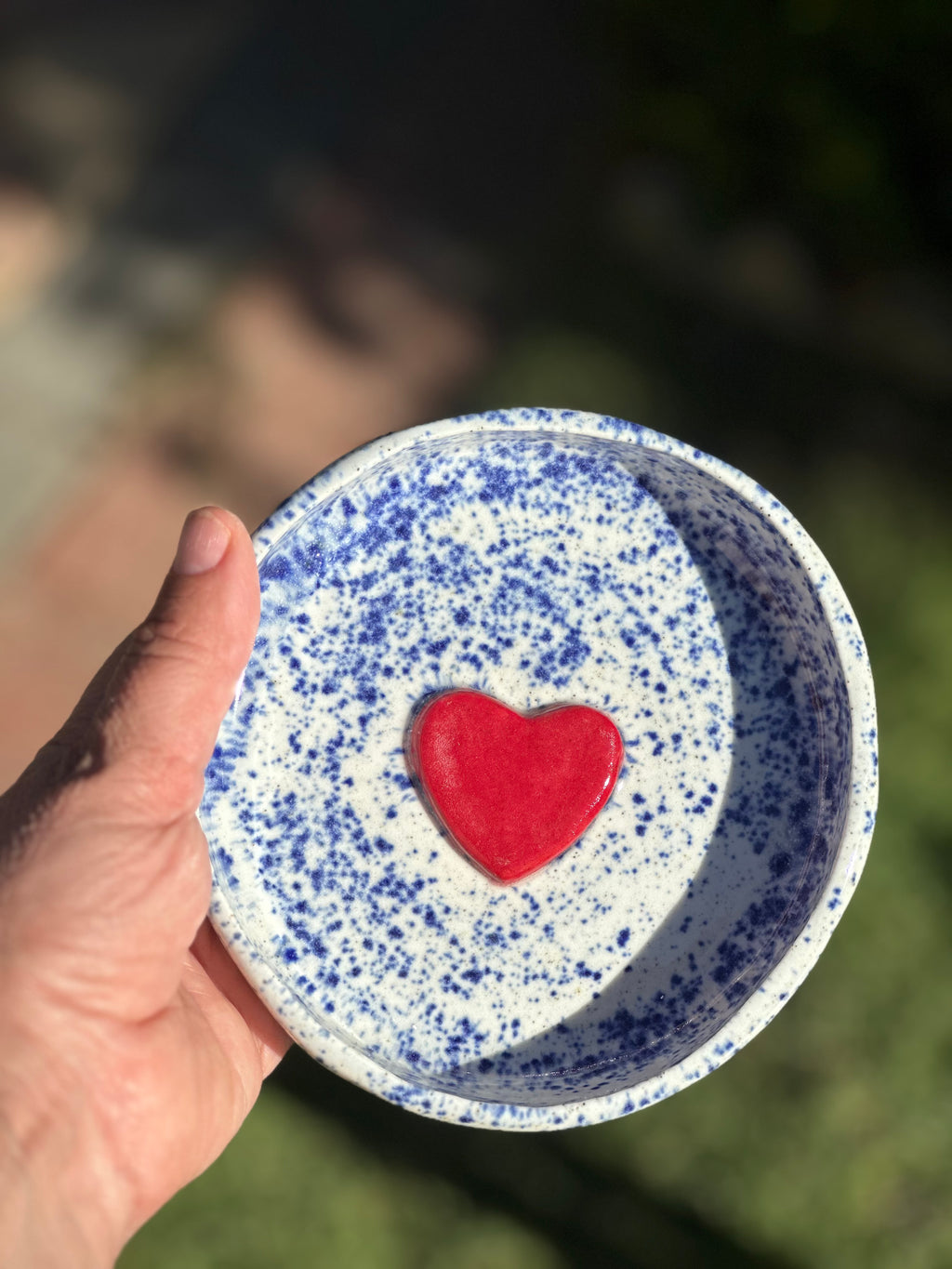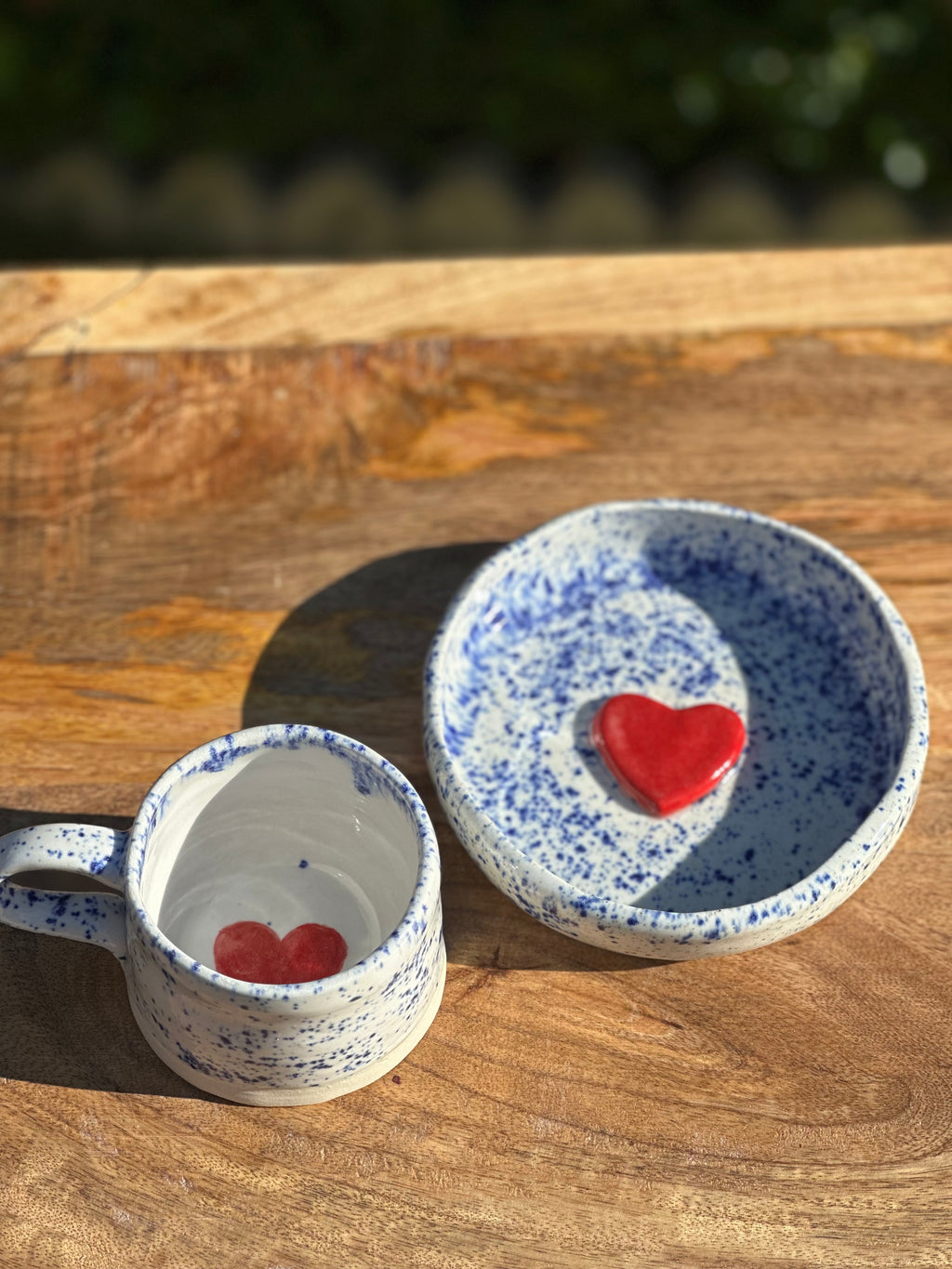 This pairing brings together a handmade ceramic mug and sort of matching blate, both finished in a soft splatter blue glaze with a small red heart revealed inside.