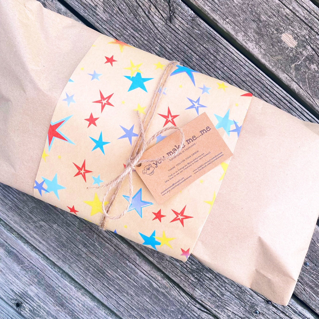Each sock animal is lovingly package up in brown paper and then decorated with some gift paper and twine.