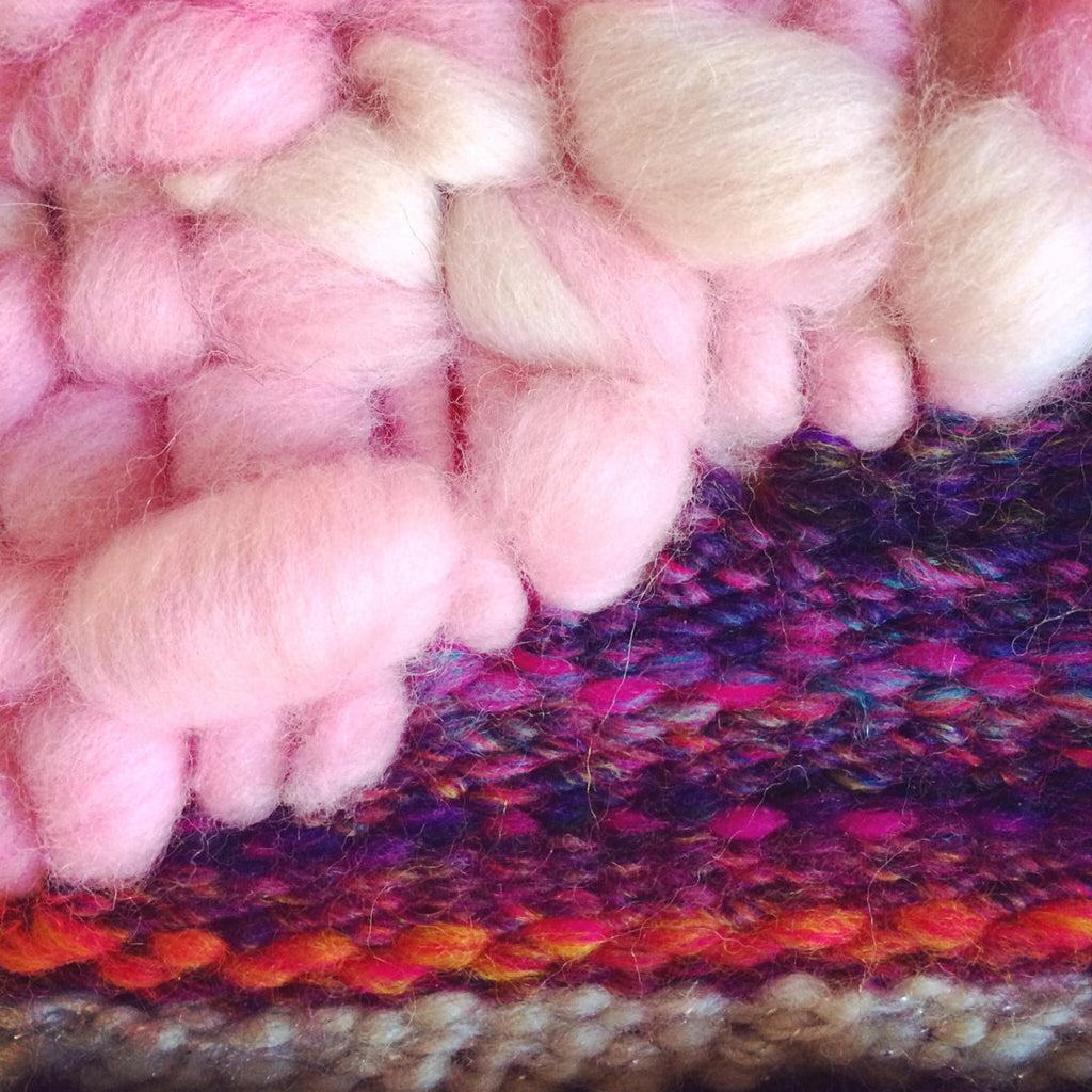 Hand woven MEDIUM tapestry in cream pure merino roving and burgundy, pinks with orange stripe and pink roving wool accent, hangs from a clear Tasmanian oak wooden dowel.