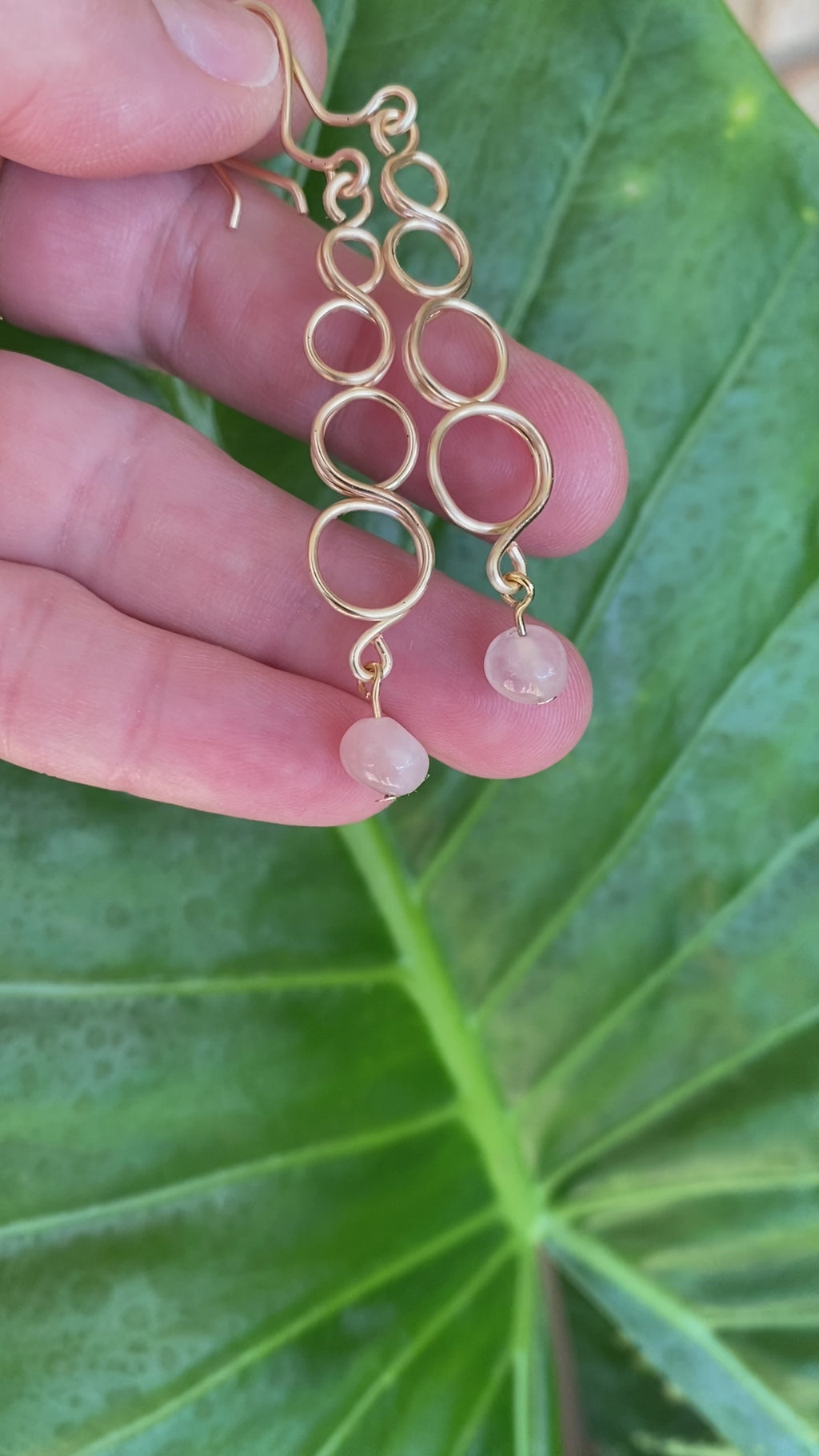 A simple minimalist earring design that has been created in my signature 'loop the loop' pattern using gold plated wire. Handmade natural rose quartz crystal gemstone bead drops hang at the bottom of the loops to create some movement and a splash of colour to the design.