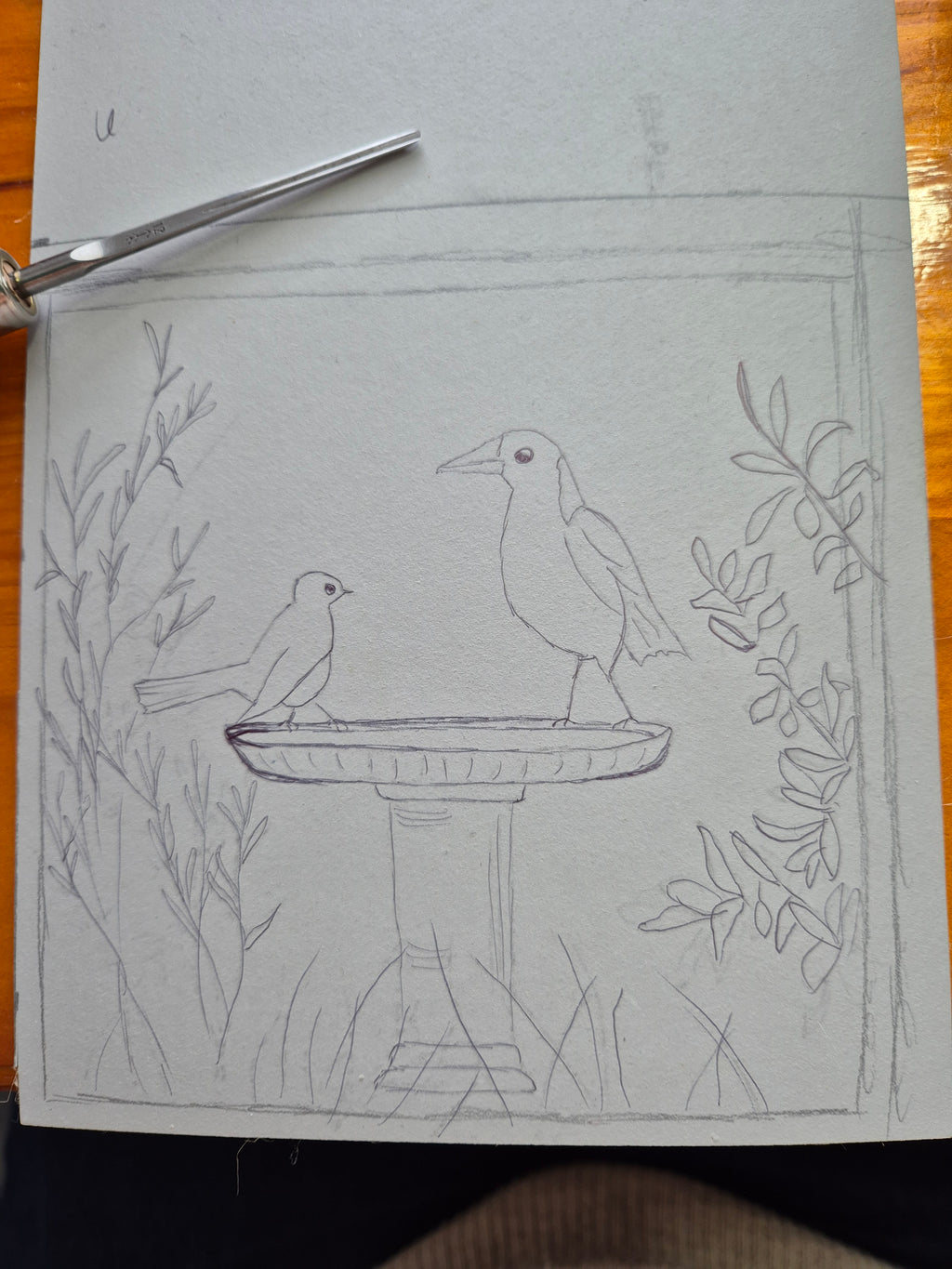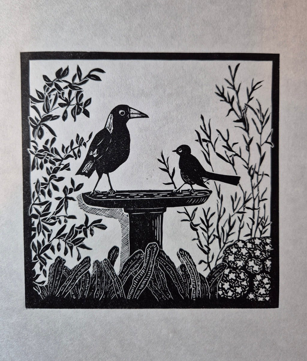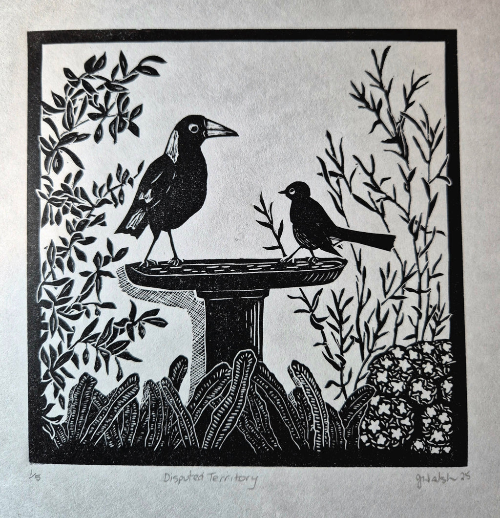 This artwork is called Disputed Territory and shows a Magpie and a Willy Wagtail eyeing each other on the rim of a shared birdbath surrounded by Australian native plants.
