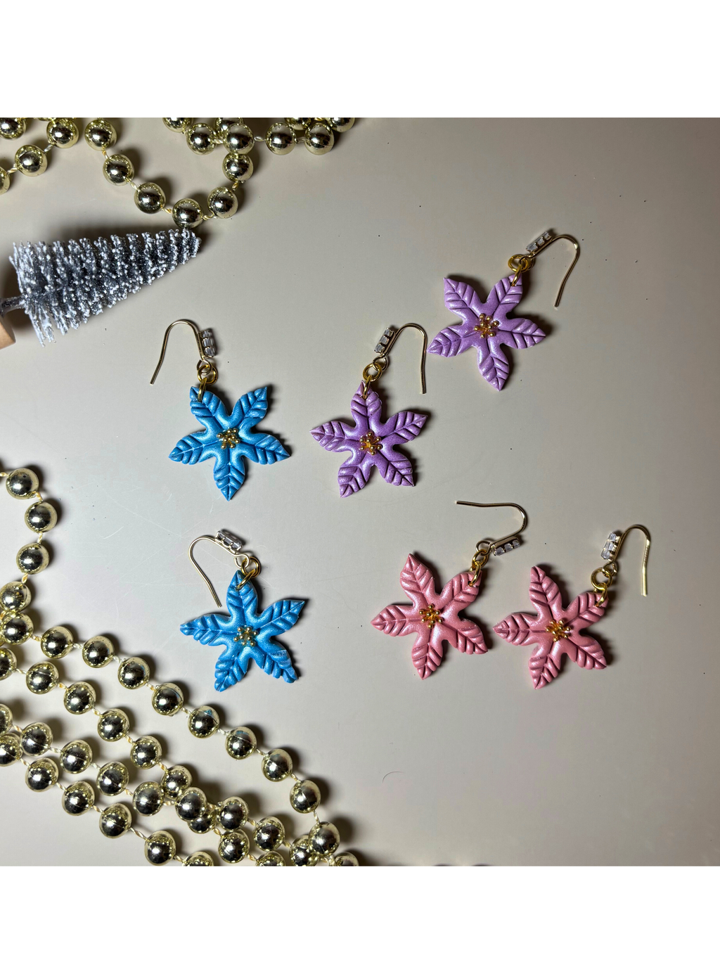 Brighten up your festive season with these delicate Pastel Poinsettia Dangle Earrings, handcrafted in small batches from premium polymer clay and finished with a soft pearlescent shimmer. Each pair features a five-petal poinsettia design, embossed with fine leaf texture and dusted with pastel mica powder for a luminous, elegant glow.