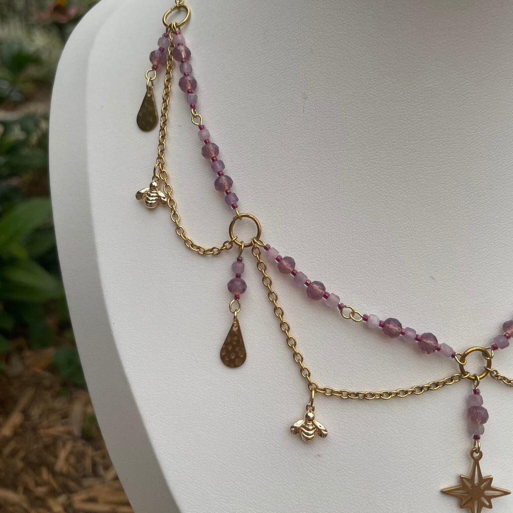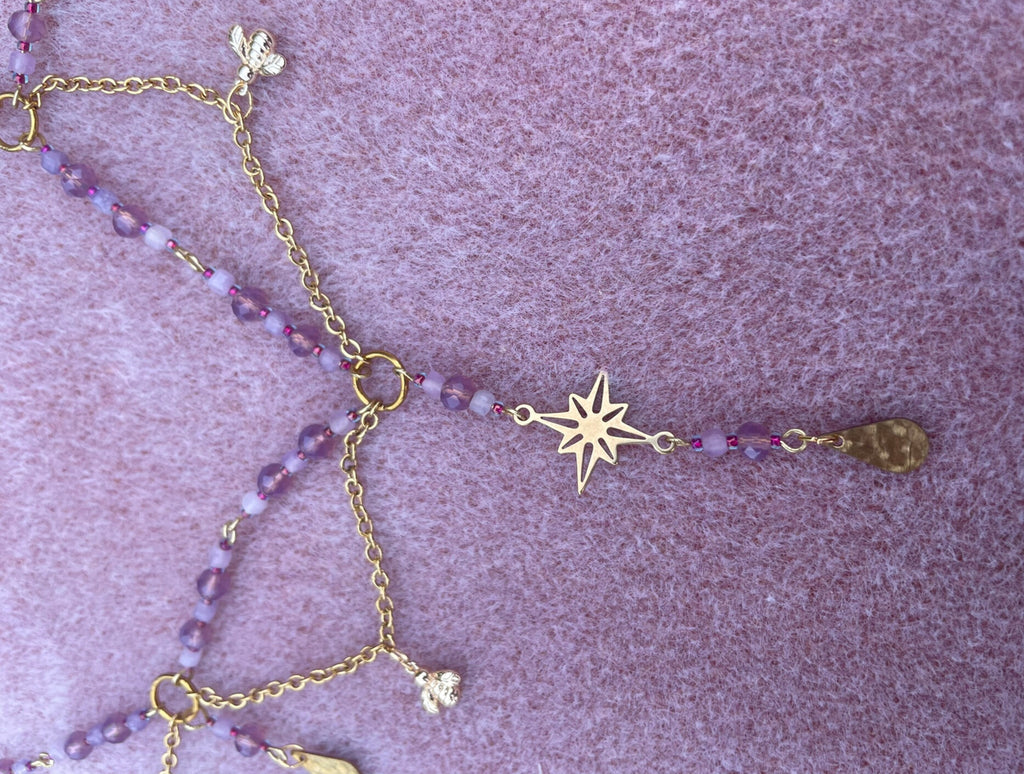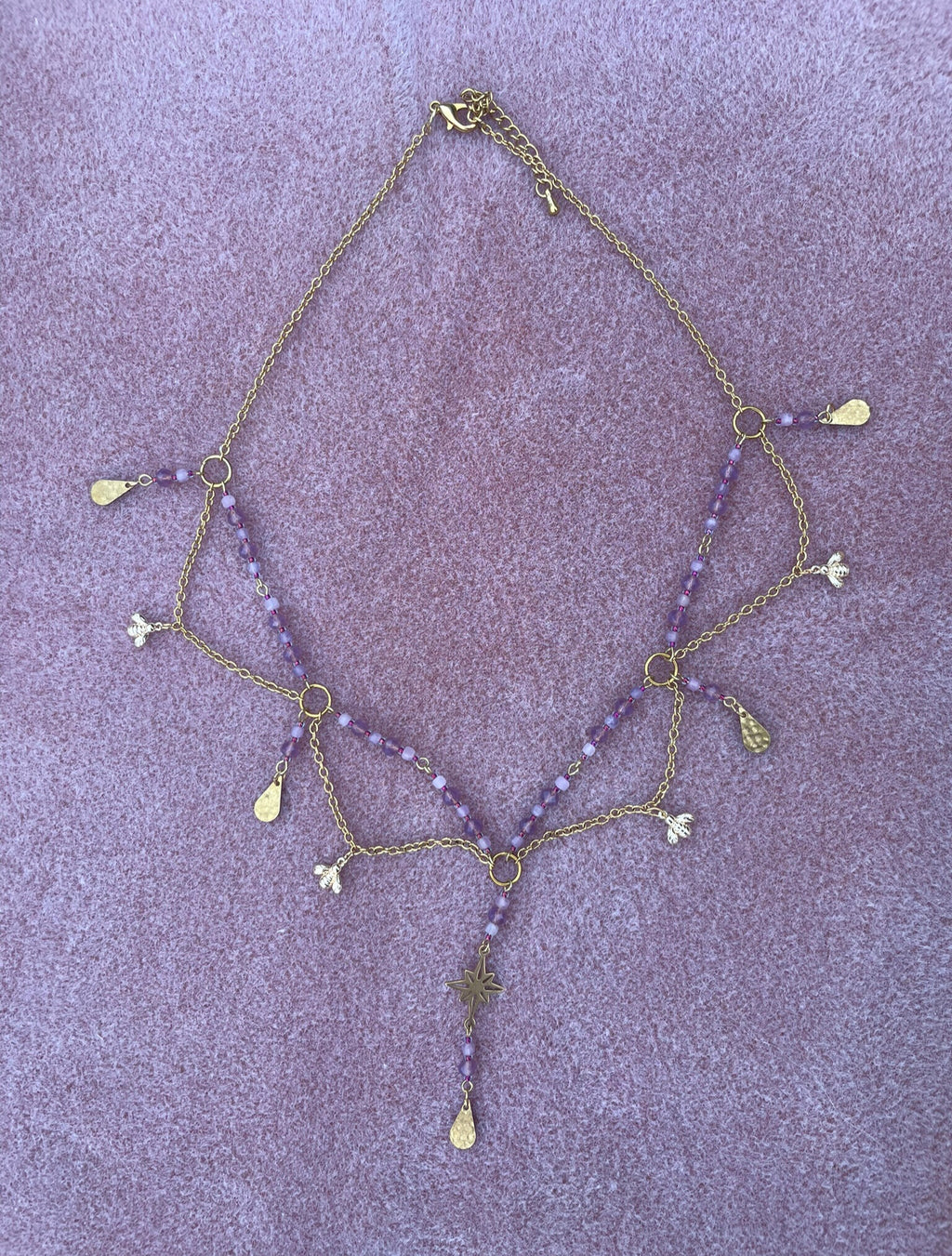 This gorgeous beaded necklace has been designed and made at my home studio in Brisbane. It has a detailed design with beaded wire sections complemented with gold-plated stainless steel and brass charms and findings. It is approximately 40cm long with a 5cm long extension chain. I highly recommend watching the video as it is difficult to capture the beauty in still pictures.
