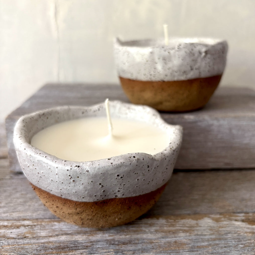 As each bowl is individual hand-pinch into shape so there is variation in form and colour from candle to candle. These differences are embraced, as they are a part of the handmade process and creates a unique piece of pottery. Please note that colours may also vary slightly due to differences in computer screens. Please also note this listing is for one candle only.