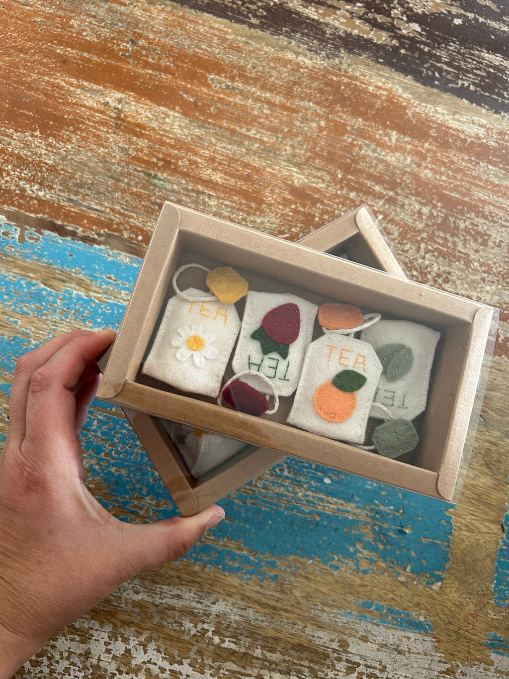 The set comes neatly presented in a sturdy cardboard box with a clear, see-through sleeve, making it ideal for gifting and easy storage. With charming embroidered details and soft cotton strings, these felt tea bags are a wonderful addition to play kitchens, tea parties, and role-play setups.