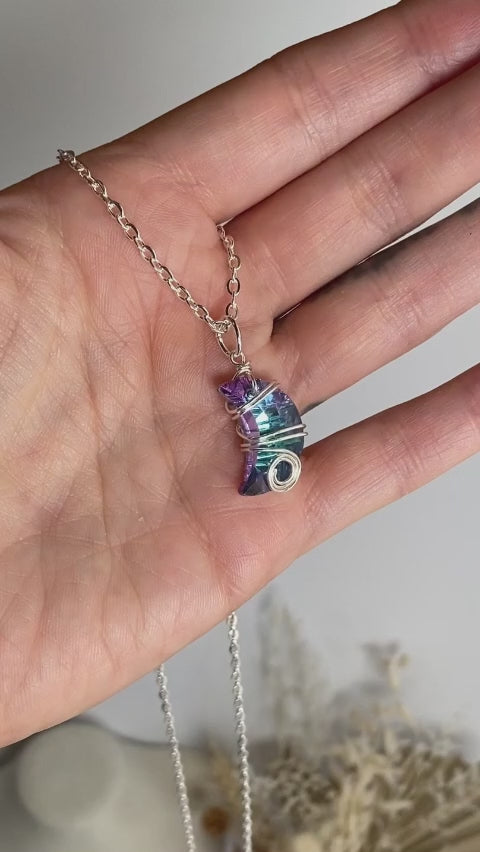 This spell-binding crescent moon pendant is sure to catch the eye on its silver chain necklace. The beautifully faceted crystal shimmers with vitrail blues, purples and turquoise, with silver wire wrapping and spiral motif.