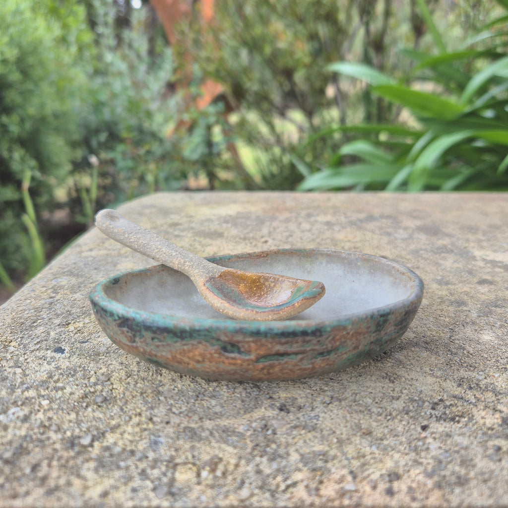 Perfect small pottery dish for holding chutneys, dukka, salt or anything really! A special handcrafted pottery spoon adds a perfect complement to your platters for any occasion.
