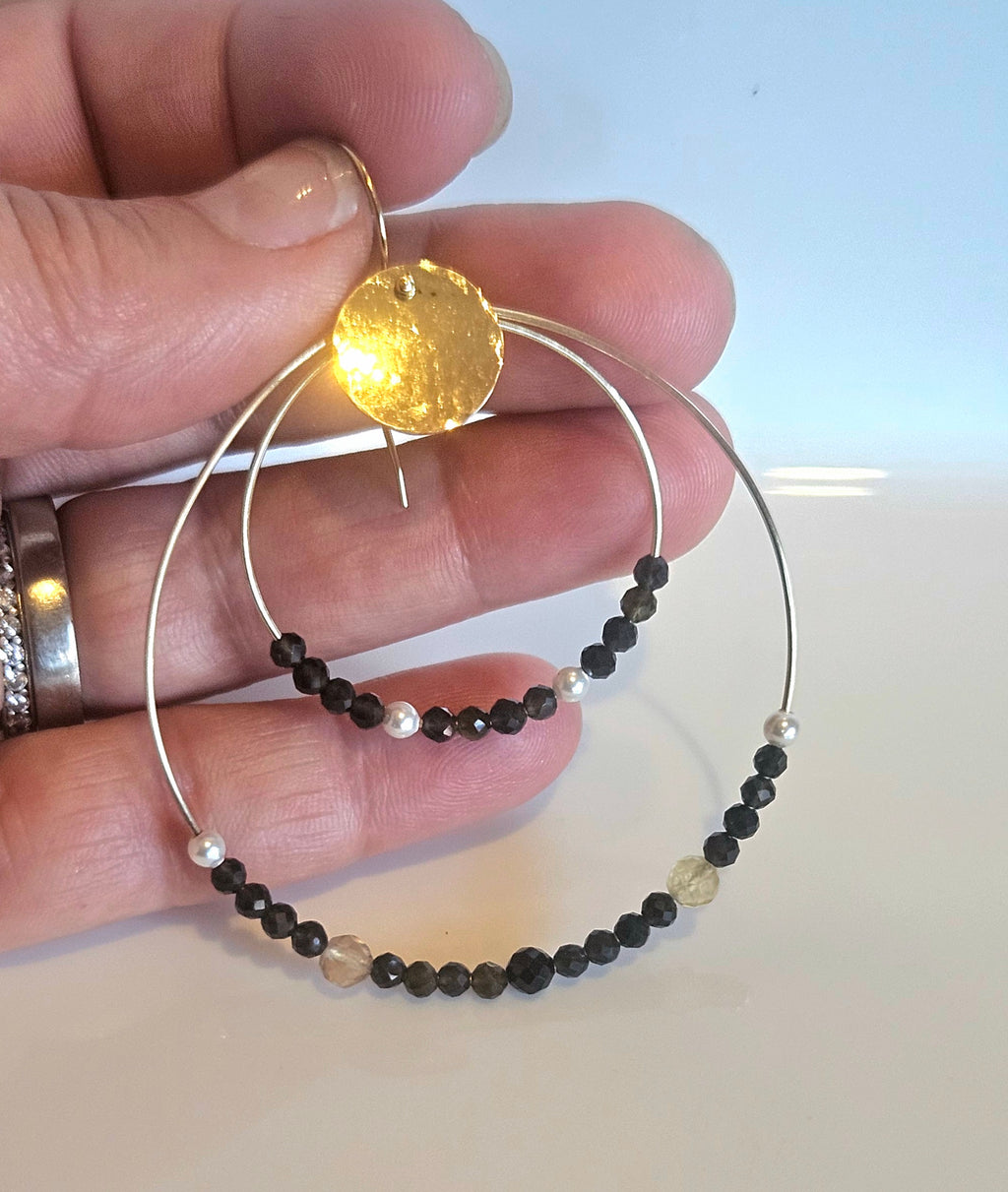 The hoops are carefully measured and connected in a central point. The gold disc is hand cut, drilled and hammered. The ear hooks are also handmade. The outer hoops is 5.2cm or 52mm internal central diameter. Inner hoops are 3.2cm or 32mm. These are made from 14 carat gold foil or gold filled. The little beads are; golden Obsidian, gold Flourite, black Spinel and Swarovski pearls.