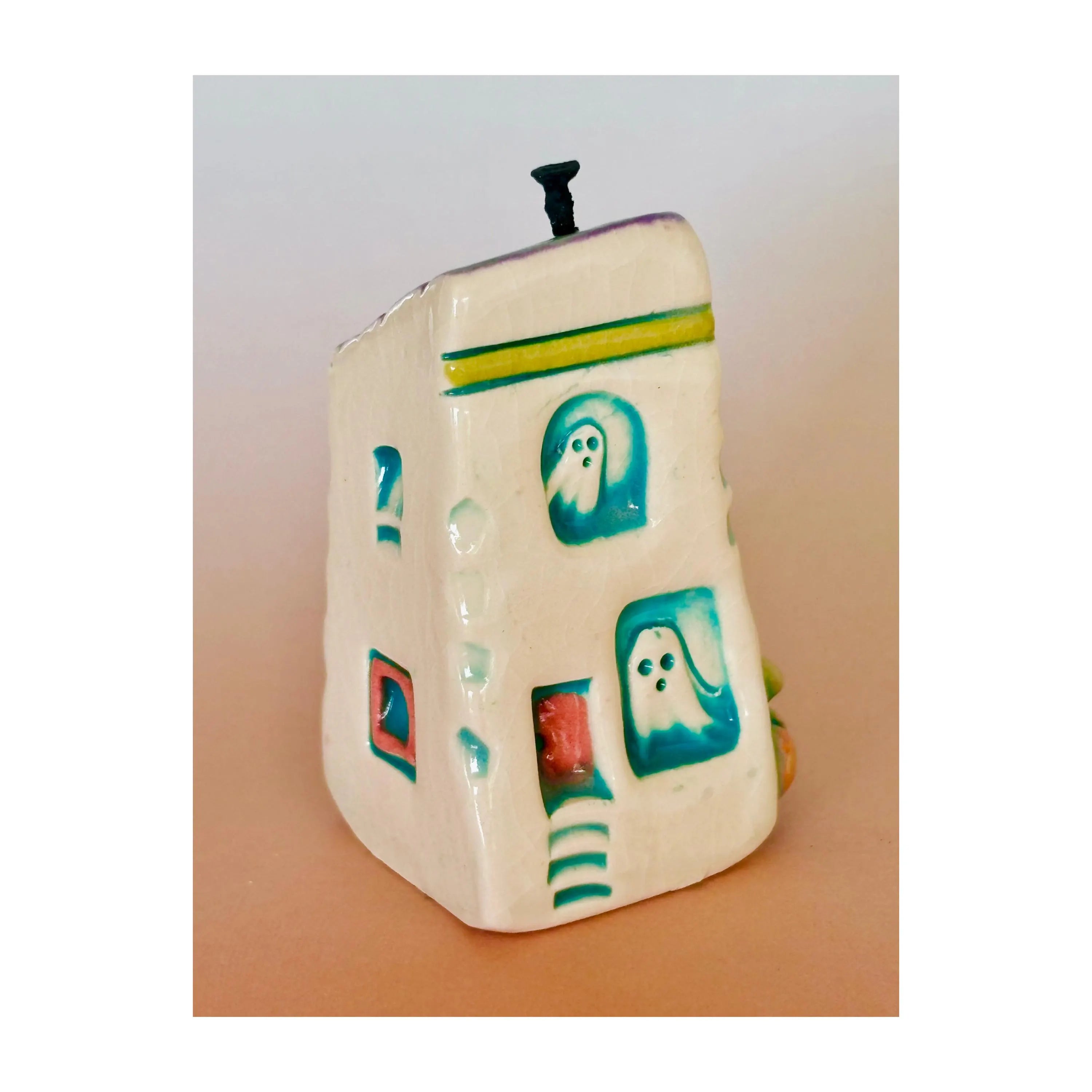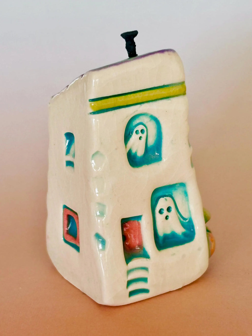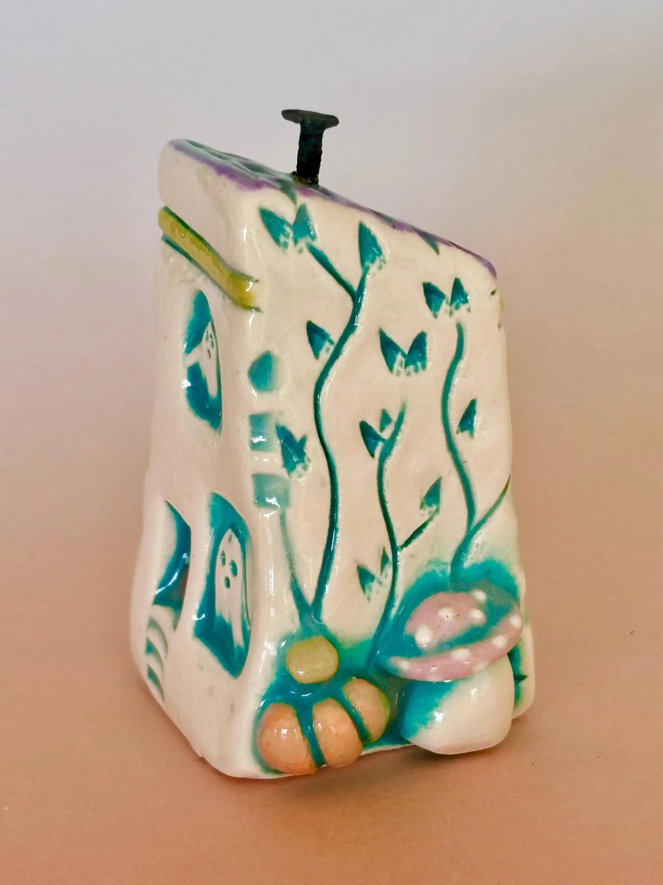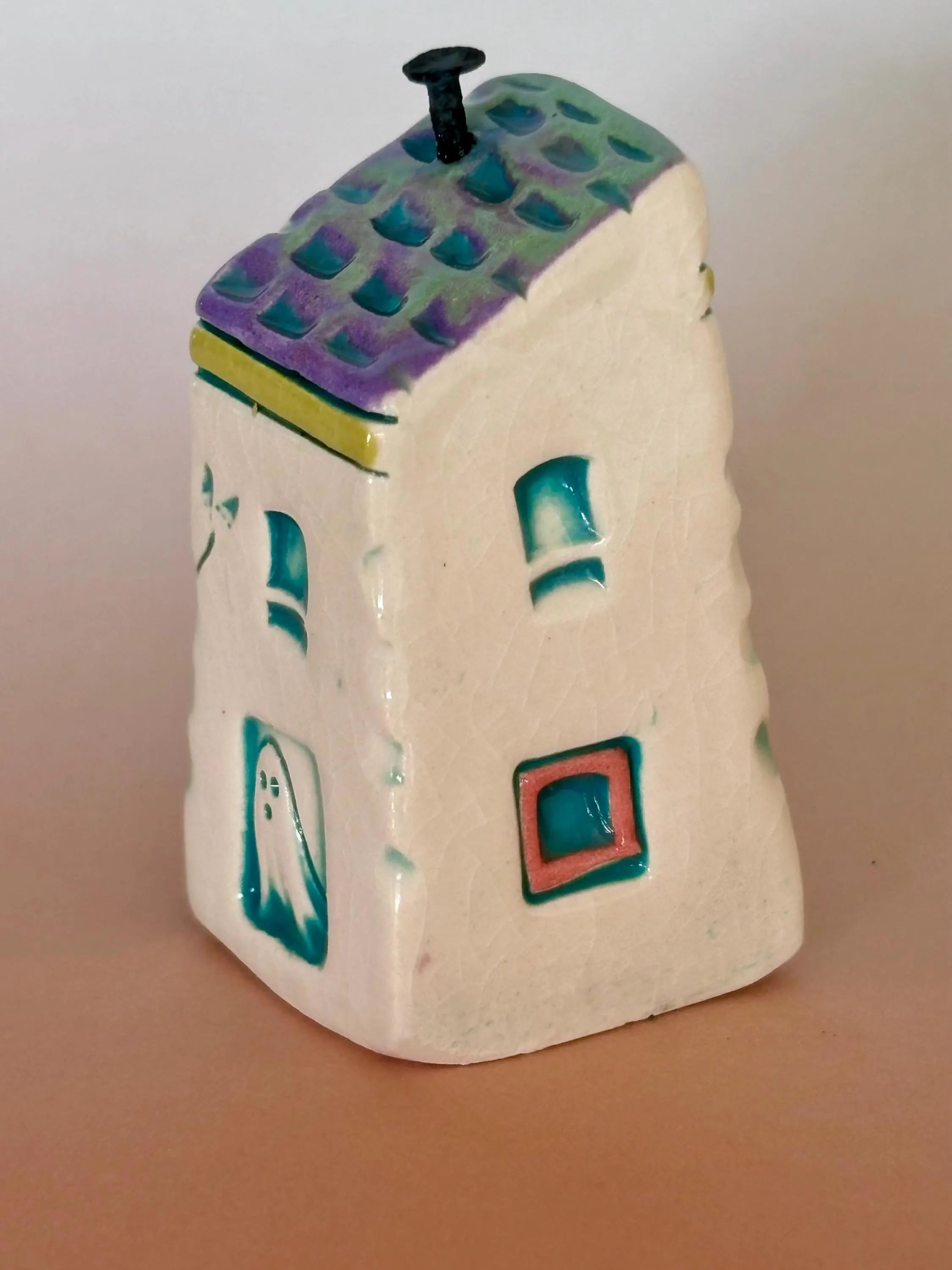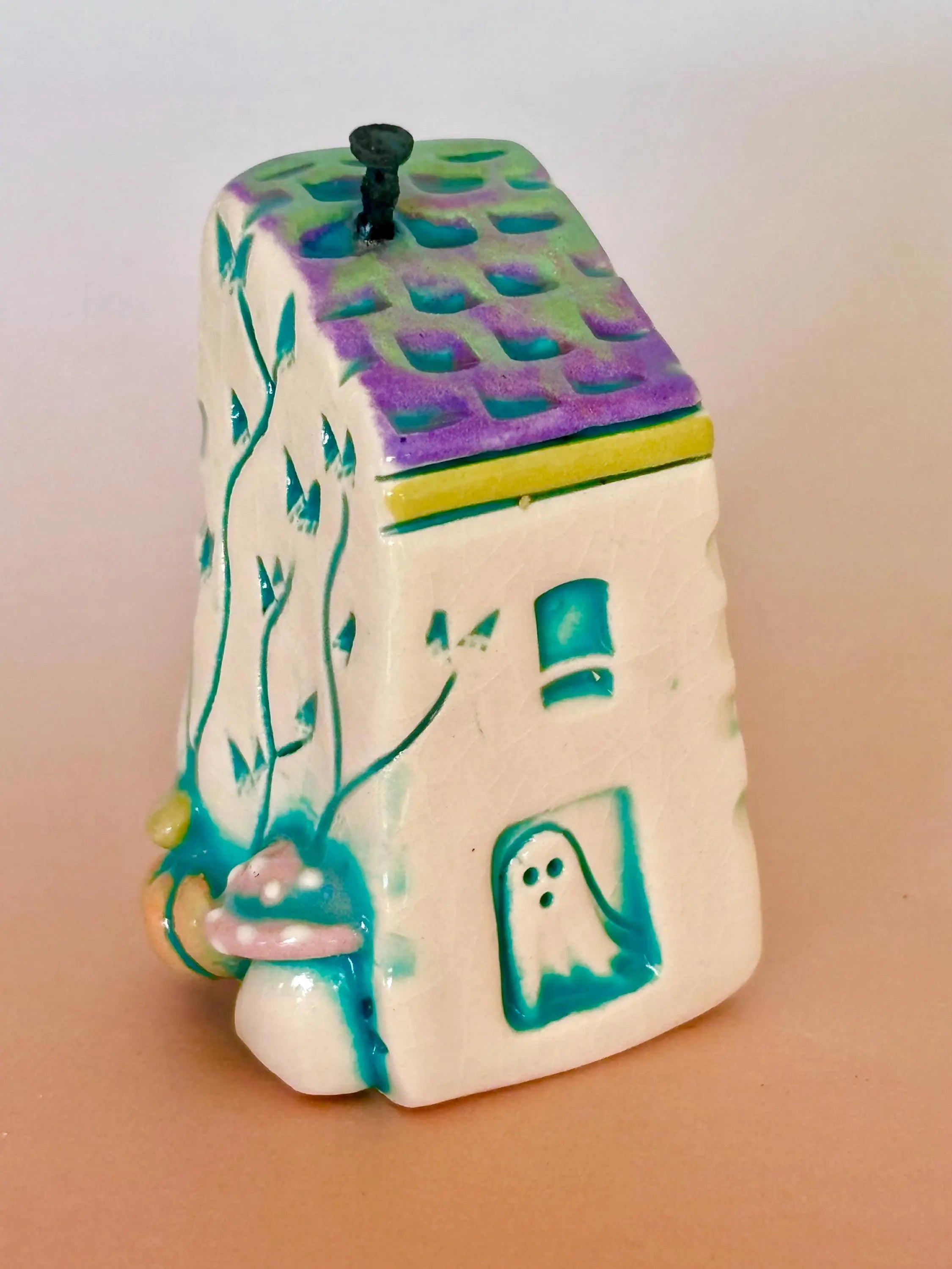 Built from layers of richly coloured underglazes, each spooky structure has its own eerie aura, moody textures, and witchy charm. Finished with a glossy clear glaze for a spectral shine and a touch of protection from the elements — perfect for indoor or outdoor display.
