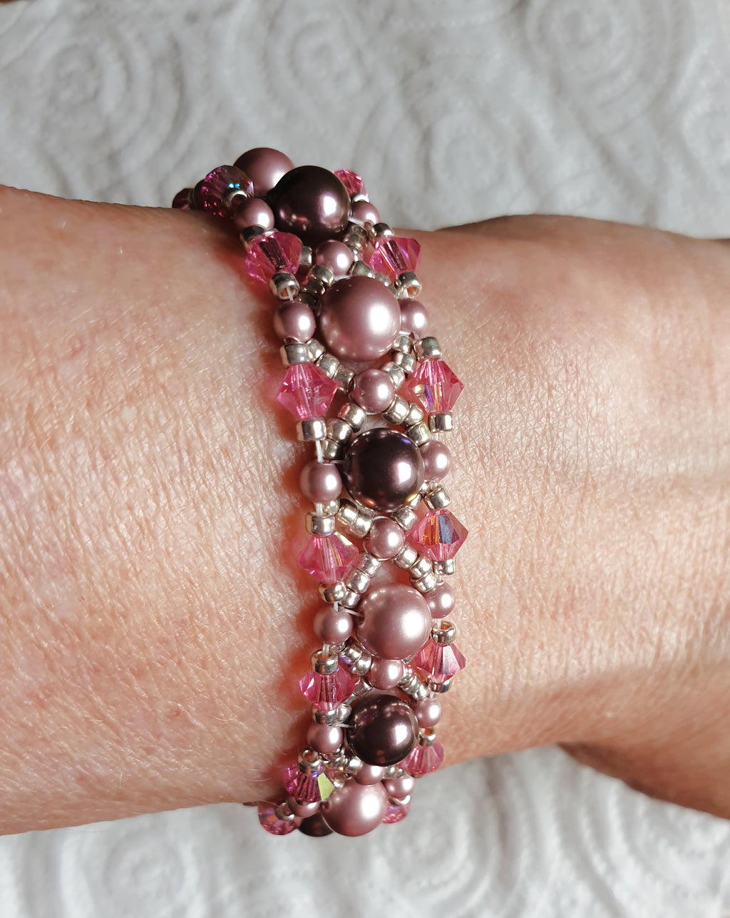 This delicate, sparkly bracelet was hand beaded using Swarovski pearls, crystals, and Japanese seed beads.
