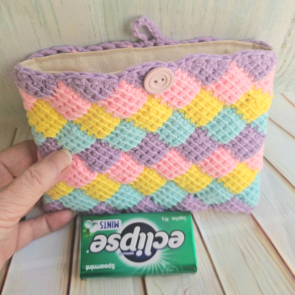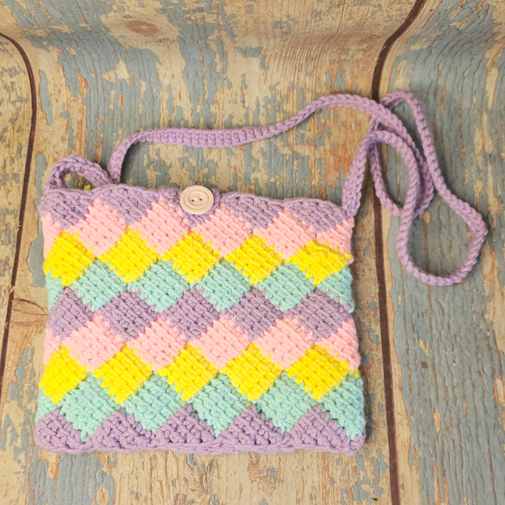 Add a touch of elegance to your everyday with this beautifully handcrafted Tunisian Diamond crochet bag. Featuring a soft diamond pattern in soft cotton blend pastel hues and a button closure with loop fastening. This fully lined accessory is as practical as it is pretty. The bag measures approx. 17cm wide by 14cm high (excluding strap which measures approx. 76cm) and would be a unique gift for the little girl in your life.