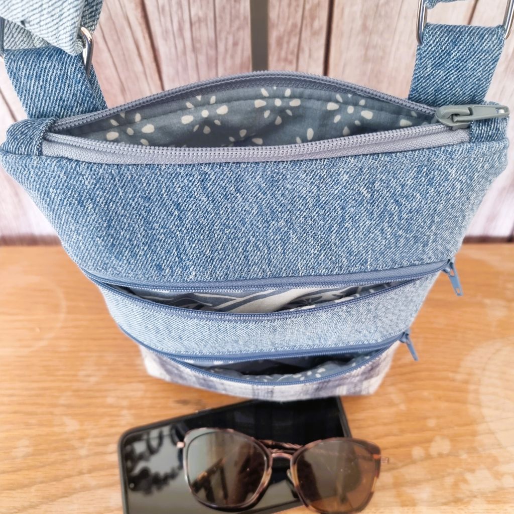 This versatile little crossbody bag is a fabulous smallish size to carry easily and can carry a lot. It has a zip along the top that opens to reveal a simple open interior, and two zipped pockets across the front.