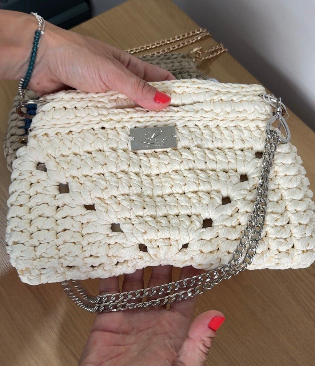 Chic, versatile, and effortlessly stylish — the Verona Clutch is handcrafted with soft yet durable polyester T-shirt yarn, giving it a unique texture and modern appeal. It features an adjustable chain strap, allowing you to wear it three ways: as a shoulder bag, a crossbody, or remove the strap completely and carry it as a classic clutch.