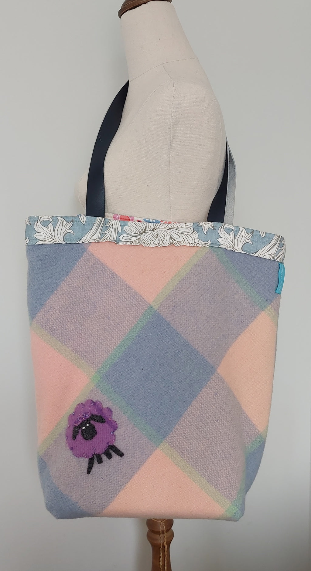 Meet Gina a handmade upcycled tote bag using vintage woollen Australian blankets and coordinating fabrics. Quality made reversible tote with leather handles and removable padded leather base.