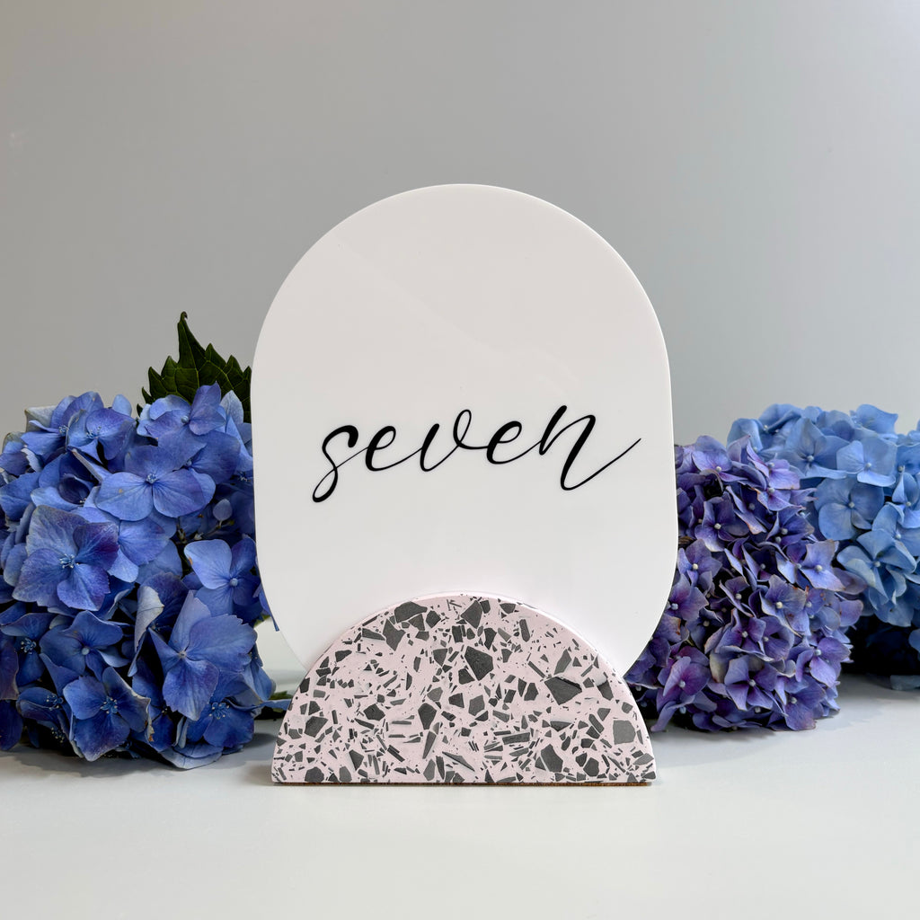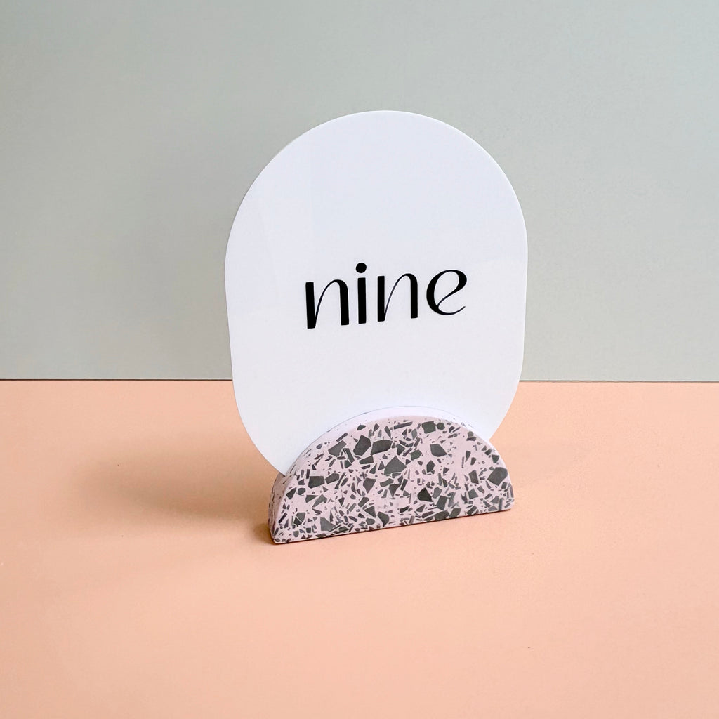 These gorgeous soft pink with black terrazzo table numbers will add a touch