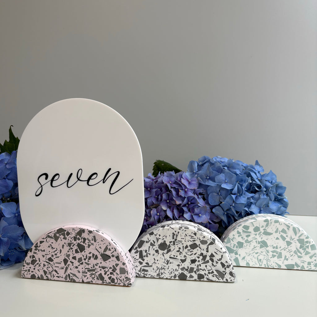 The bases of these table numbers are created using eco acrylic resin, using a handmade unique, one of a kind mould I created, hand-sanded then sealed in a matte water resistant sealant, with a cork base added