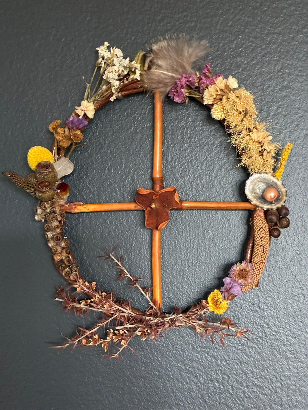 Solar/Earth Cross Wreaths are Hand Crafted with all natural materials found in nature. Including, Shells, Flowers, Seeds, Feathers, Crystals, Berries. This wreath holds the symbol of the Solar Cross. In Astrology, this symbol represents Planet Earth. It is a potent ancient symbol that goes way back in time and has been found carved into walls in many ancient caves all over the world