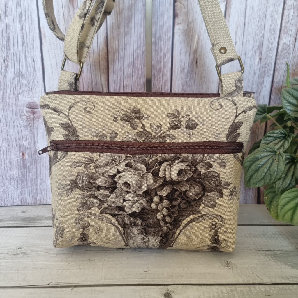 I found this gorgeous Italian Renaissance-style canvas upholstery fabric as a whole piece in my local op shop. It is a lovely rich cream with a sepia brown coloured design of an urn filled with old roses and fruit.